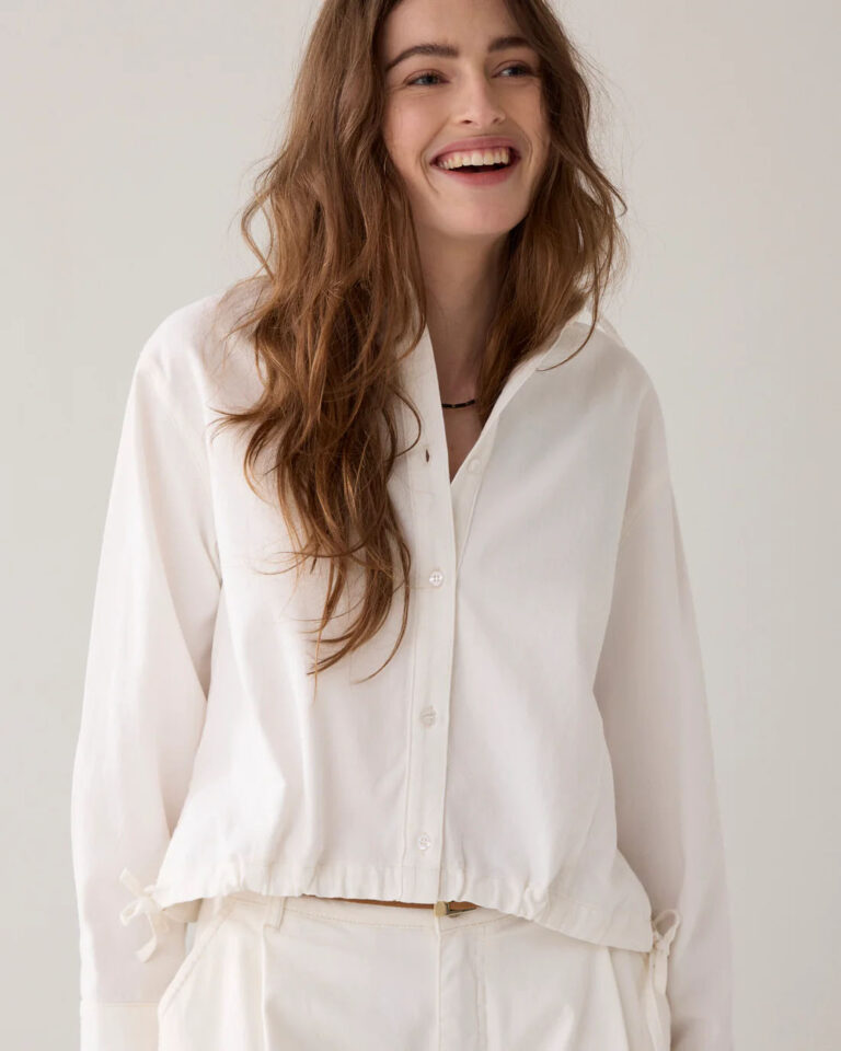 De verstelbare koordzoom in een tunnel maakt het mogelijk om de pasvorm naar wens aan te passen, waardoor je de blouse los of juist meer getailleerd kunt dragen. Een fijne basic met een stoere denim twist.