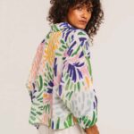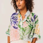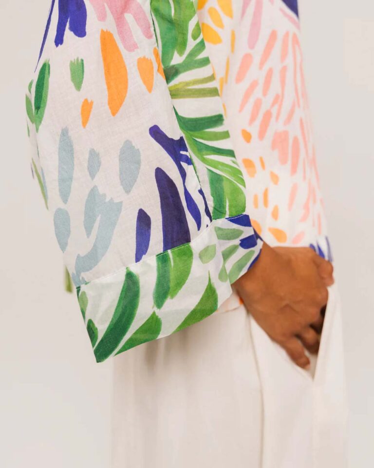 Blouse Laelia Multicolor print van het merk Sacrecoeur is een wat korter model, gemaakt van zacht katoen. Het item is bedrukt met een kleurrijk, schilderachtig motief. Voorzien van comfortabele kimono-lange mouwen, een klassieke overhemdkraag en zichtbare knoopsluiting. De brede manchetten maken het geheel af en geven een stijlvol, opvallend accent.
