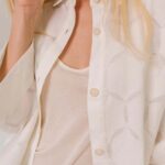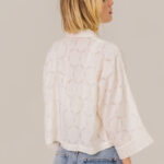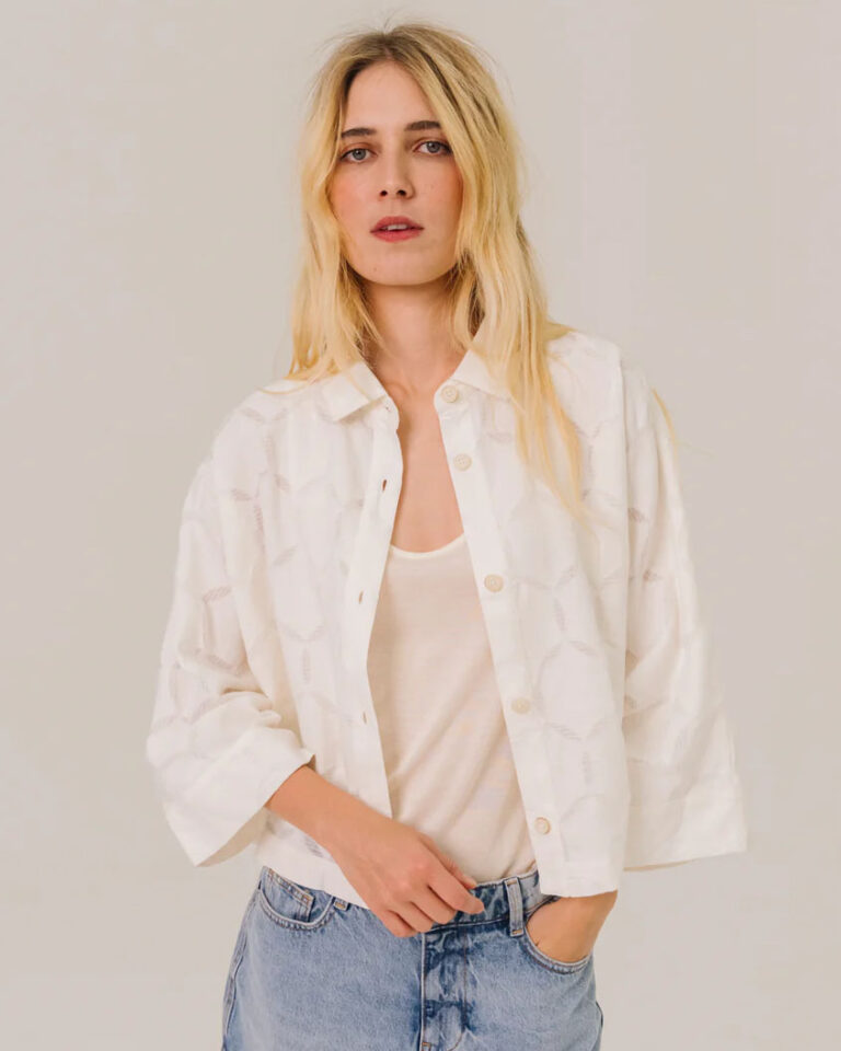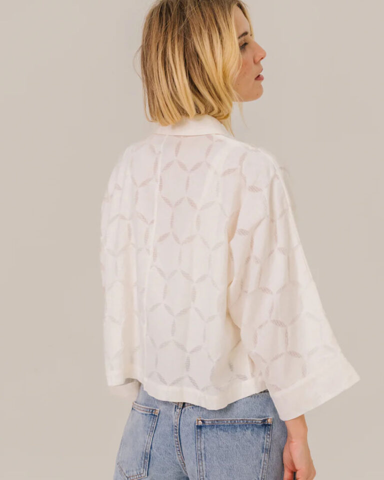 Blouse Laelia Off White van Sacrecoeur is een ietwat oversized overhemd in een zachte mix van katoen, viscose en linnen. Het subtiel ajourรฉ effect geeft textuur en luchtigheid, terwijl de kimono-lange mouwen extra comfort bieden. Voorzien van een klassieke overhemdkraag, zichtbare knoopsluiting en brede manchetten voor een moderne, uitgesproken look.