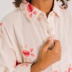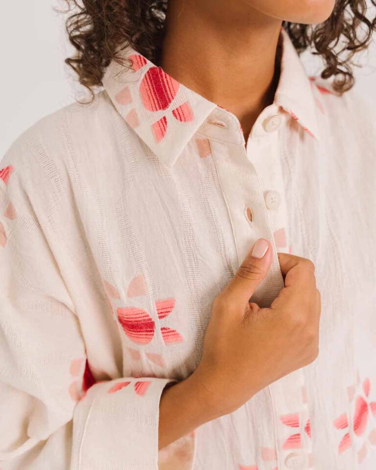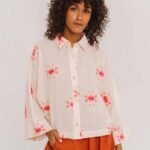 Blouse Laelia Sol in ecru van Sacrecoeur is een wat korter, ietwat oversized overhemd met subtiele, ingeweven zonmotieven. Voor de ultieme zomerlook! Comfortabele kimono-lange mouwen, klassieke overhemdkraag en zichtbare knoopsluiting maken het geheel af. Brede manchetten zorgen voor een moderne, uitgesproken touch.