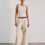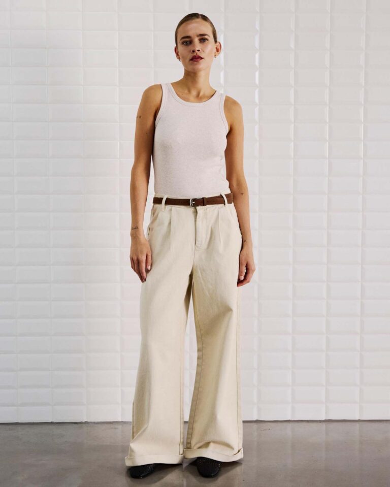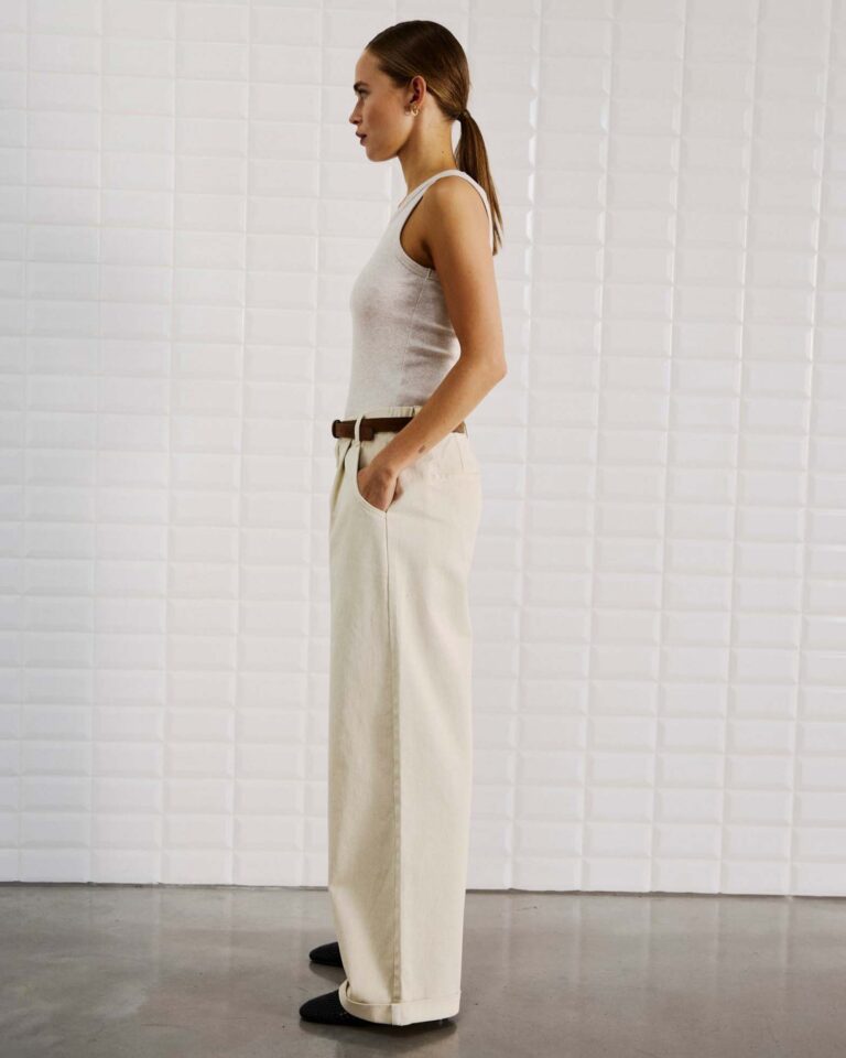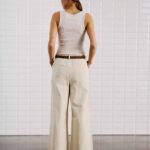 Broek Steffi Silver Lining van With Black is een stijlvolle jeans met wijde pijpen en een subtiele turn-up voor een moderne twist. De broek heeft een high waist en een loose fit, wat zorgt voor een comfortabel en flatterend silhouet. De stof bevat geen stretch en geeft de broek een mooie, stevige look. Aan de voorkant zitten schuine steekzakken en een plooi die het geheel extra vorm geeft. De paspelzakken aan de achterkant houden het ontwerp clean. De broek valt op volledige lengte en is afgewerkt met een elastische tailleband aan de achterkant, riemlussen en een sluiting met knoop en rits.