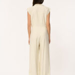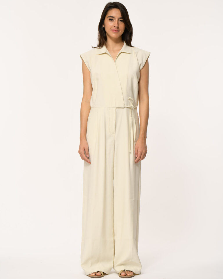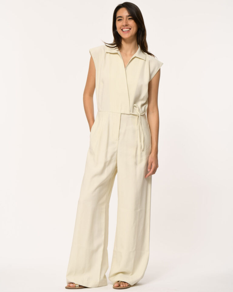 Jumpsuit Fantine in het ecru van La Fee Maraboutee is een mouwloze jumpsuit met een stijlvolle overslaghals die je in de taille strikt voor een mooi gedefinieerd silhouet. Het voorpand is afgewerkt met plooidetails aan beide kanten, wat zorgt voor een moderne, flatterende fit. Een effortless statement piece dat chic en comfortabel samenbrengt.