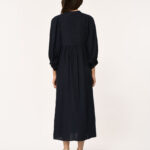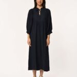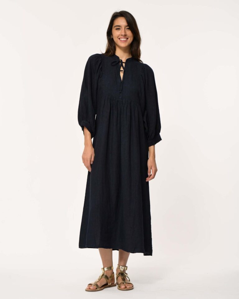 Jurk Dembo in het donkerblauw van La Fee Maraboutee is een heerlijk luchtig design! De lange linnen jurk is voorzien van eenTunesische halslijn en striklinten. Het item heeft lange pofmouwen met geknoopte manchetten. De naad onder de buste met plooien zorgt voor een soepel vallend silhouet en een vrouwelijke uitstraling. Het luchtige linnen maakt de jurk comfortabel en ideaal voor warmere dagen.
