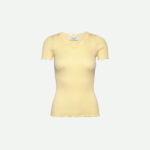 T-shirt Beatha Geel van Rosemunde is een verfijnd basic item met een vrouwelijke twist. Dit zachte T shirt met korte mouwen is gemaakt van een luxe zijdeblend die soepel om het lichaam valt. De kanten afwerking langs de halslijn geeft het item een elegante en subtiele uitstraling, terwijl de kenmerkende gerolde zoom van Rosemunde zorgt voor dat nonchalante detail waar het merk zo geliefd om is. Perfect om solo te dragen voor een minimal chic look, maar ook ideaal als stijlvolle basis onder een blazer of vest. Een tijdloos en veelzijdig item dat moeiteloos past bij zowel casual als meer geklede outfits.