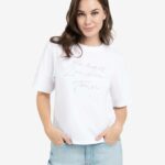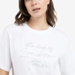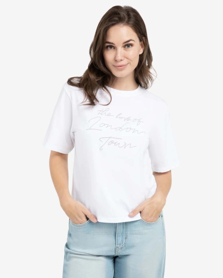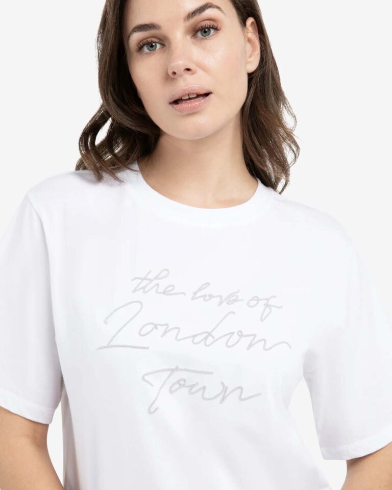 T-shirt Blue Grey Print in het wit van Yaya heeft een losse, boxy fit en korte, wijde mouwen. Op de borst prijkt een zachte flockprint met tekst โ€˜The love of London Townโ€™. Het item heeft een ronde hals en cleane afwerking is het een casual T-shirt met een stijlvolle twist.