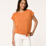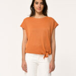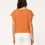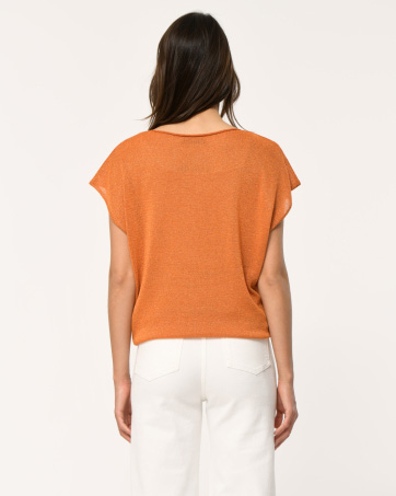 T-shirt Firby in het oranje van La Fee Maraboutee is een kort model in fijn iriserend breisel met een ronde hals en kort vallende mouwen. De zijkant is afgewerkt met striklinten voor een speels en verstelbaar detail. Licht glanzende stof die het shirt een subtiele, elegante uitstraling geeft!
